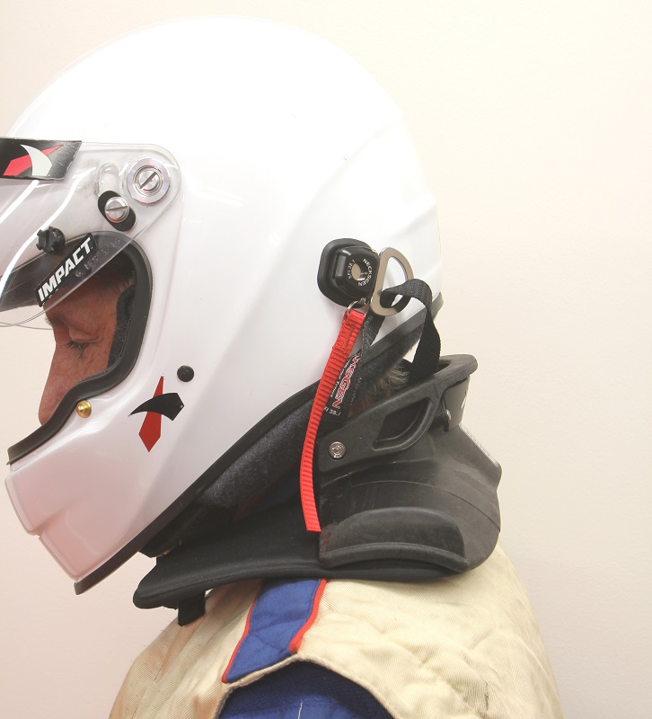 The collar rests on the driver’s shoulders and is retained by the shoulder harness. A tether arrangement ties the helmet to the device which limits severe forward head movement.