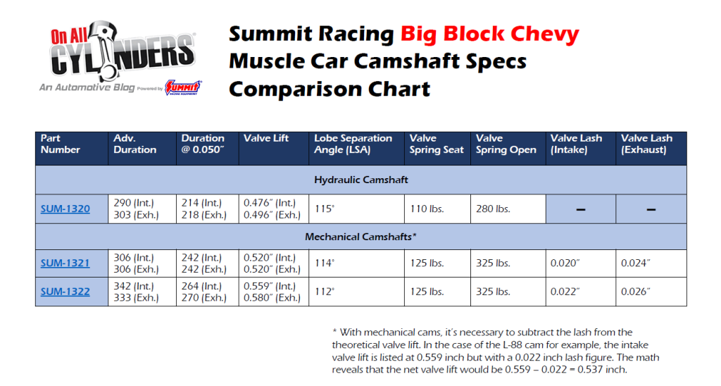 Summit Racing Big Block Muscle Car Camshaft Part Numbers, Specs & Comparison Chart