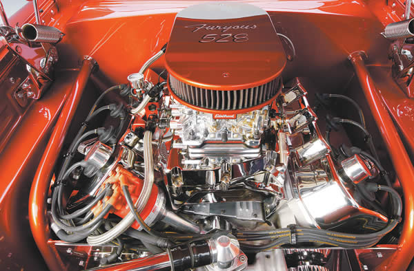 Engine: Indy 528 CID All Aluminum Street Legend Hemi (10.25:1 compression ratio, 720 horspower @ 6,300 rpm/710 ft-lbs. @ 5,800 rpm), Indy 426-1 CNC 285 cylinder heads, ported and polished, with 167cc combustion chambers, Ross pistons, Eagle Specialty Products H-beam connecting rods and 4340 crankshaft, COMP Cams R-1 roller camshaft and lifters, Indy rocker arms, Smith Brothers pushrods, Manley valves, springs, and retainers, Billet Specialties breathers