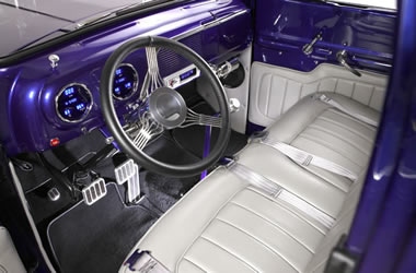 Lenny and Scott designed the functional exhaust stacks with a little help from Stainless Works. Inspired by a technique used on powerboats, Scott came up with the idea of using stainless steel bulkheads to bring the stacks through the floorboards. When you get on the ground to admire the stacks, you’ll also notice the pinstriping on the underside of the running boards, the frame, and on the driveshaft.