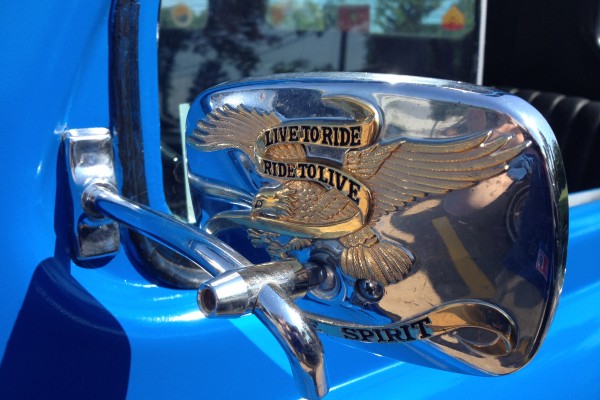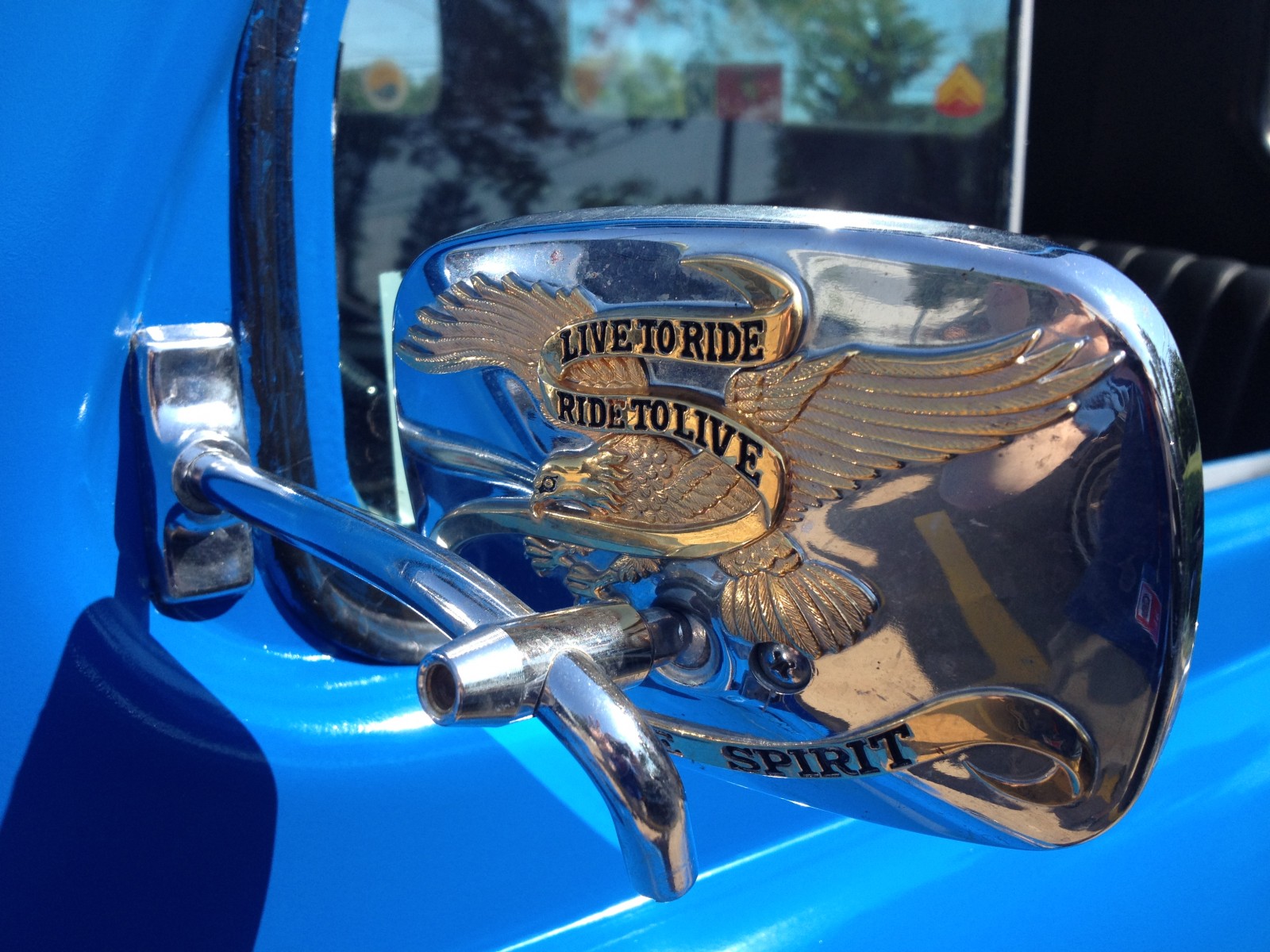 His side-view mirrors were pulled off an old Harley-Davidson motorcycle.