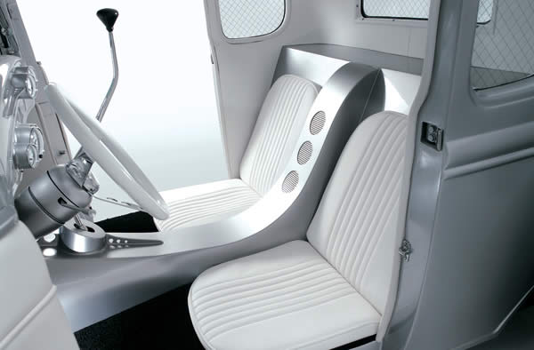 Modifications: 1930 Ford pickup dashboard, Auto Meter Old Tyme gauges with custom gauge pods, Grant Classic steering wheel, 1970 Chevy pickup steering column, custom waterfall-style console, custom safety glass and widened window channels