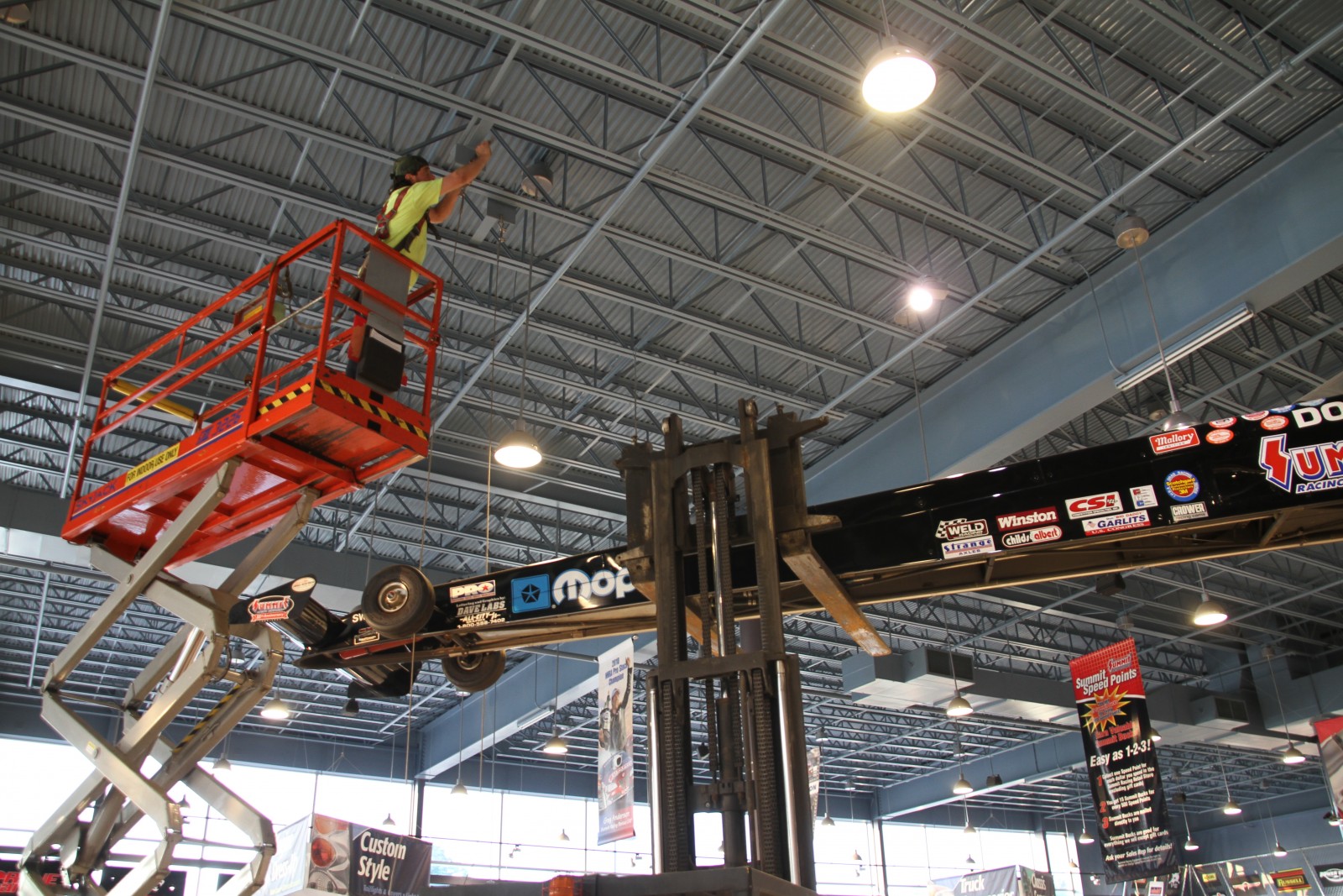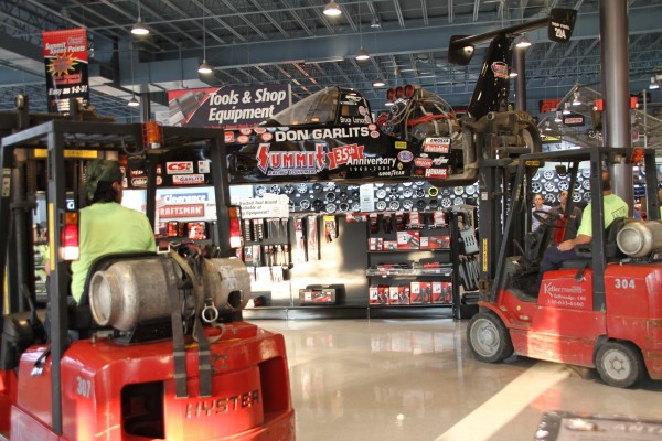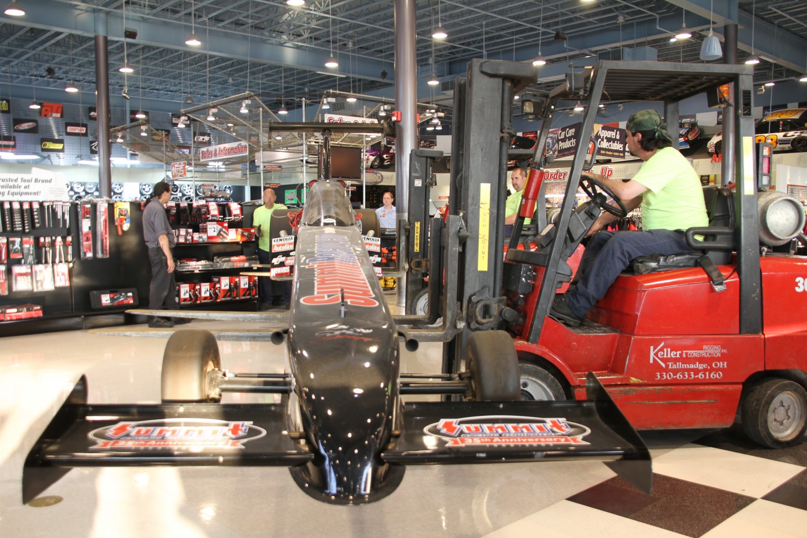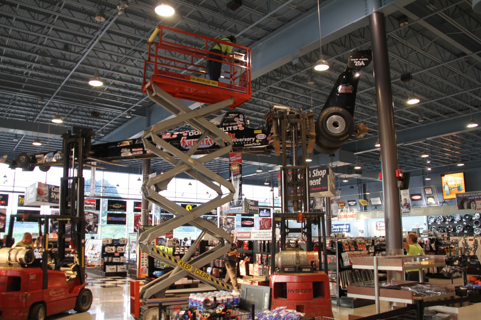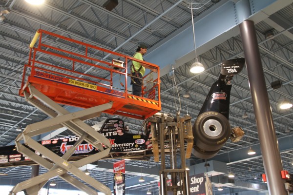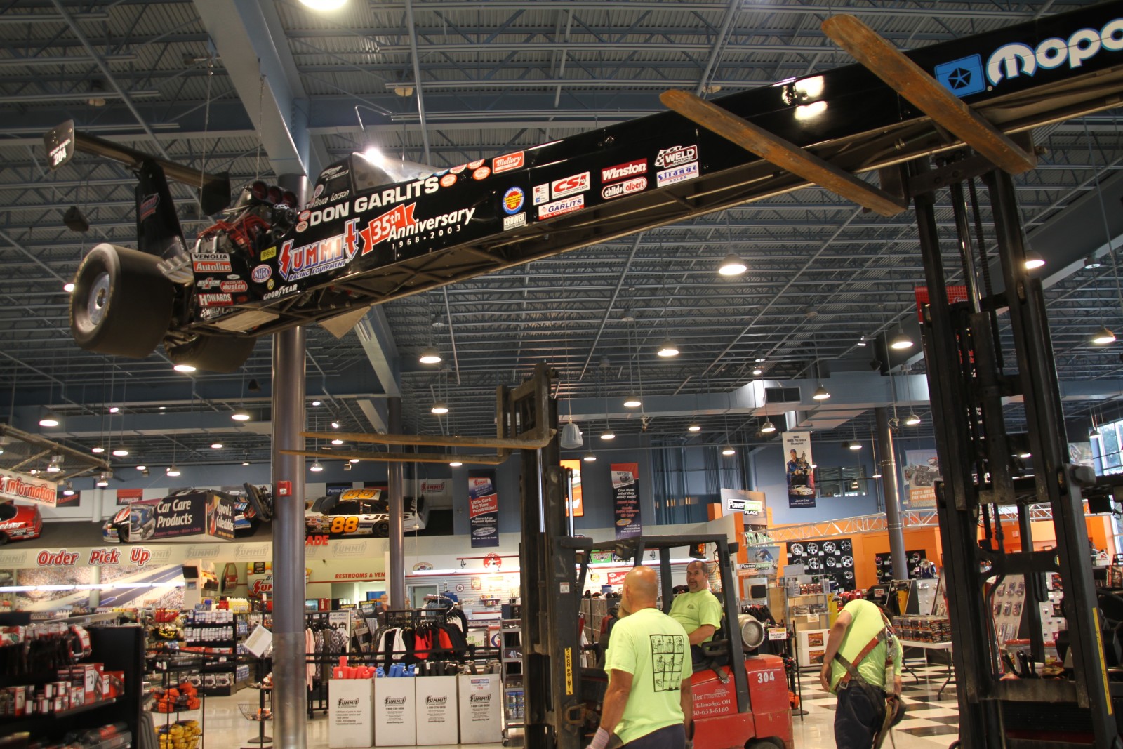 The wicked-quick dragster made an ultra-slow decent from the Summit Racing store ceiling, taking about 90 minutes to reach the ground. Keller Rigging, located in Tallmadge, OH, used two specially designed tow motors to carefully lower Swamp Rat 32 to the floor, where it provided Grosso and his team with one last enduring memory.