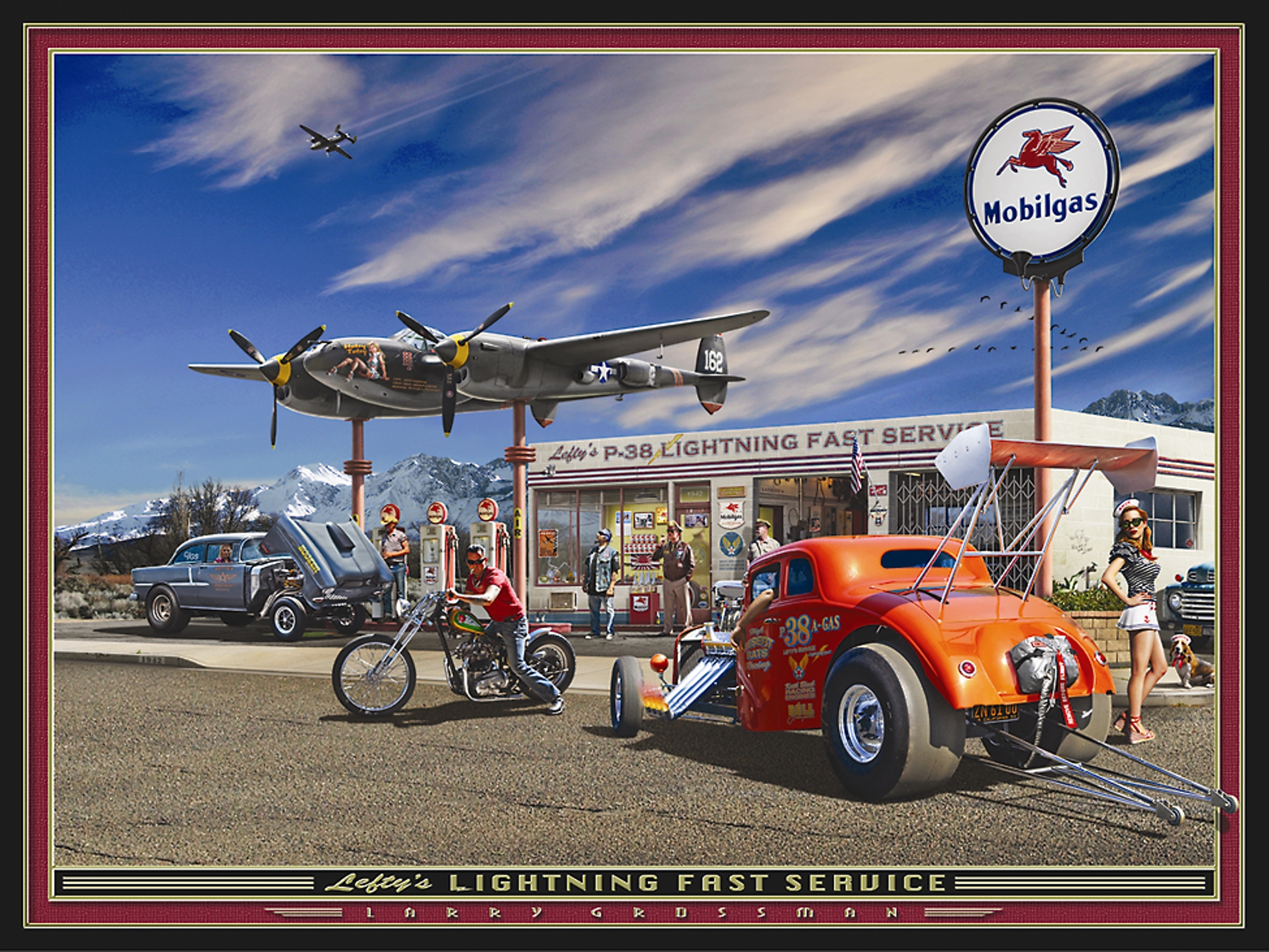 Full-Service Filling Stations: Larry Grossman Lithograph, “Lefty’s Lightning Fast Service”