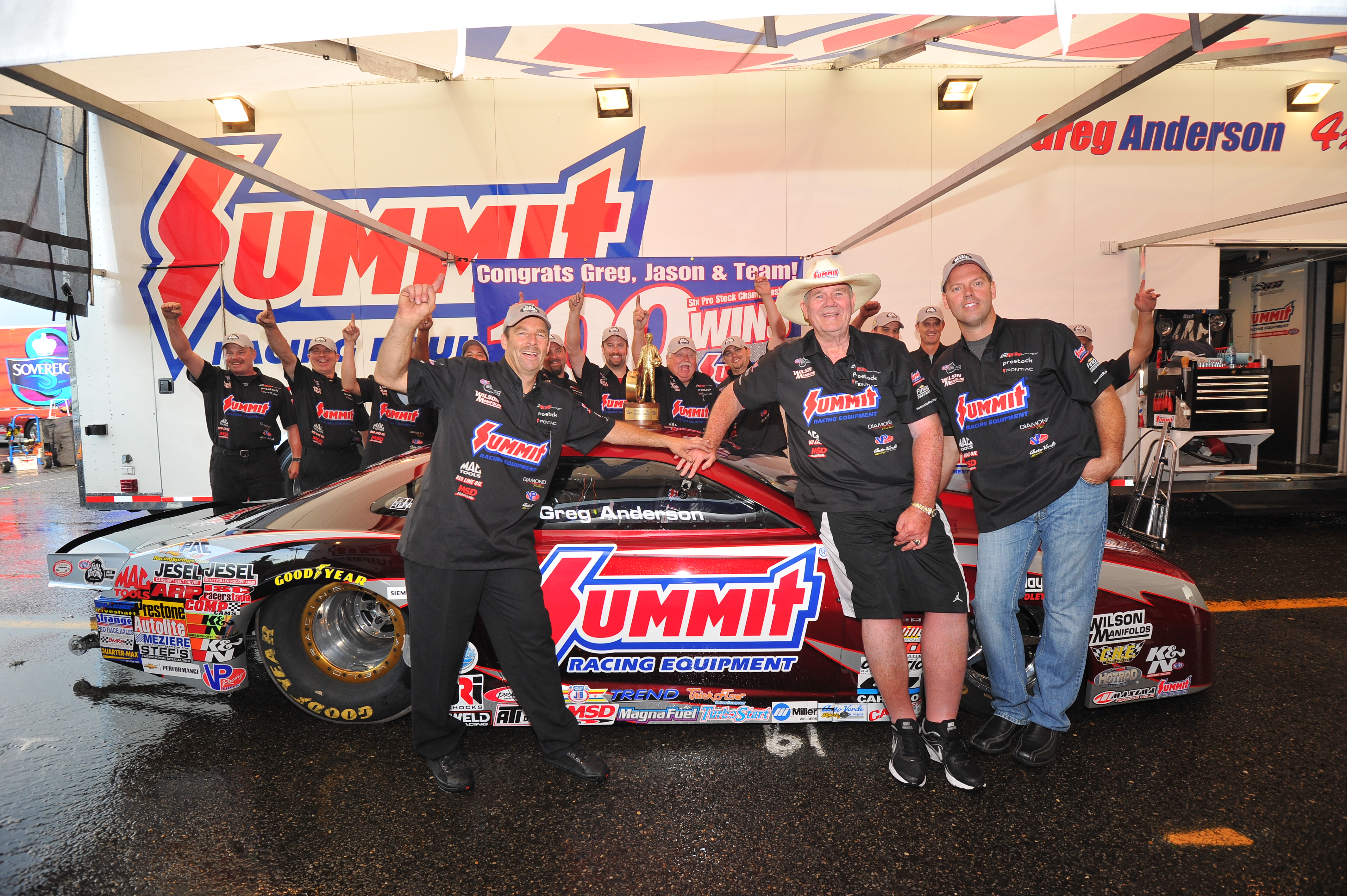 At the recently completed Toyota NHRA SuperNationals in Englishtown, NJ, the Summit/KB Racing team reached an important milestone, as Greg Anderson scored the organization’s 100th NHRA Pro Stock national event win. Making this achievement even more remarkable is that Anderson and teammate Jason Line were able to reach in the century mark only 10 years after the KB Racing team made its competitive debut at the 2002 Winternationals in Pomona, CA.