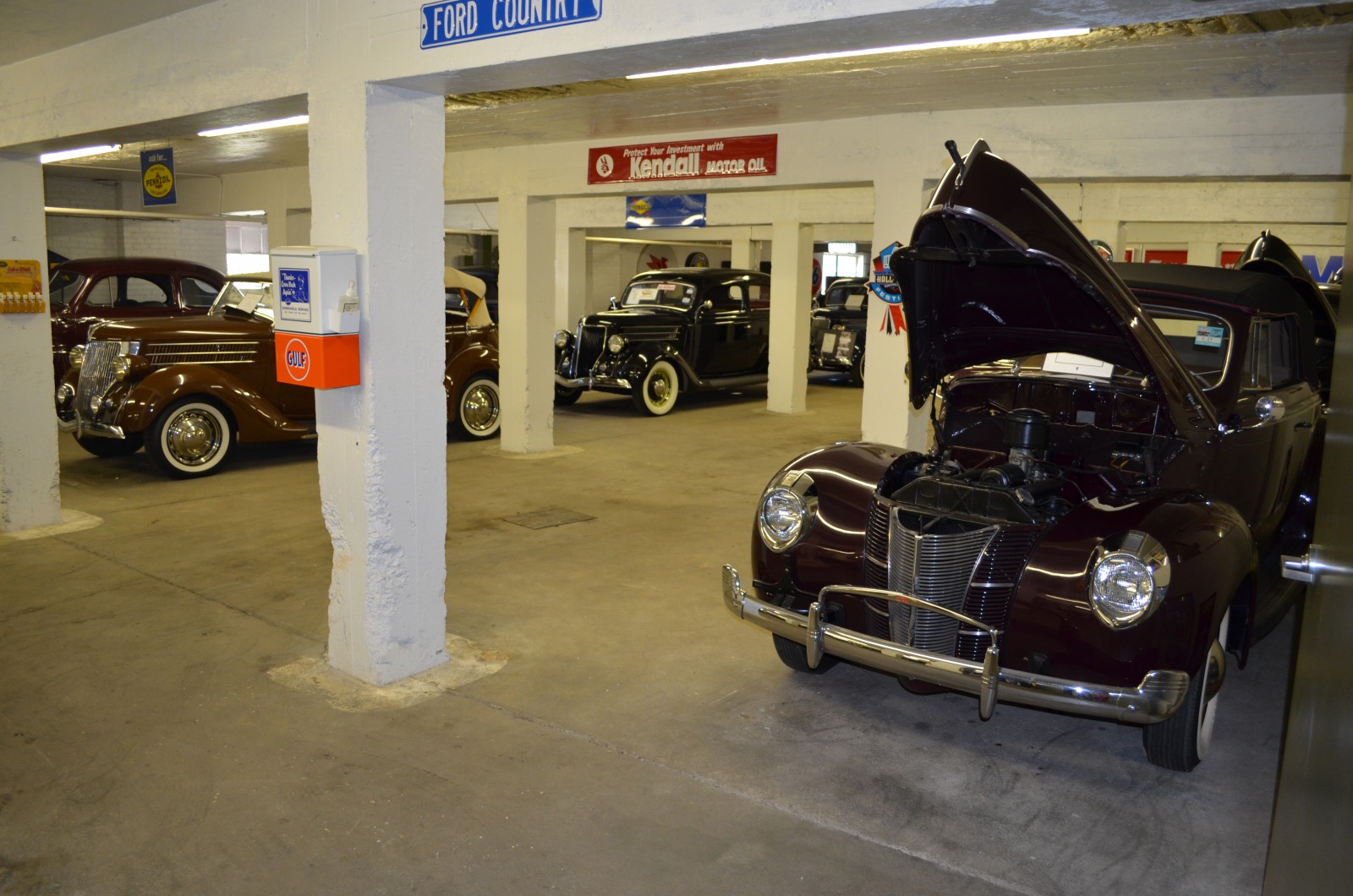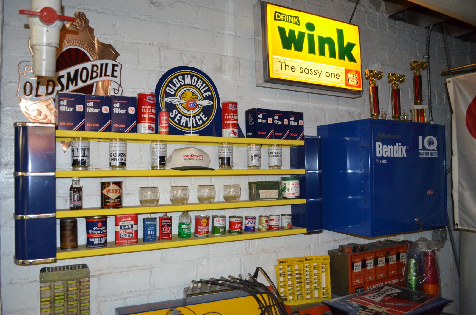 vintage oil cans and signs in car collection