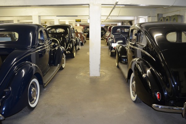 rows of antique cars stored in a museum collection