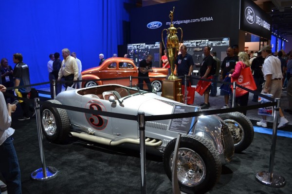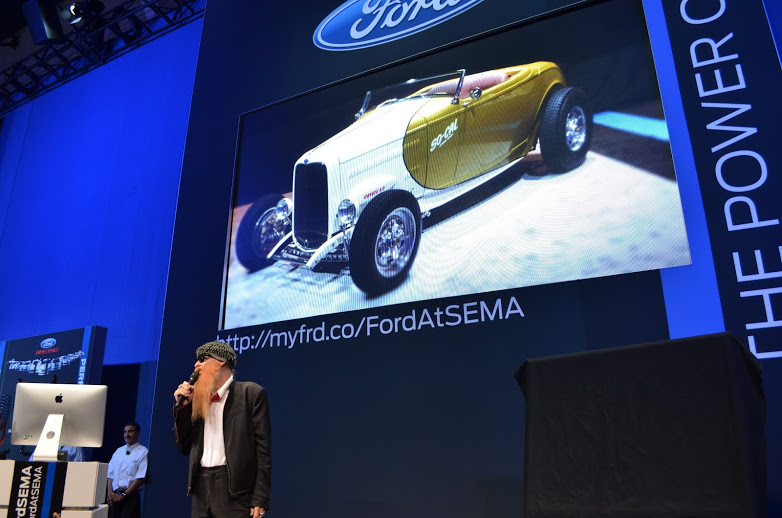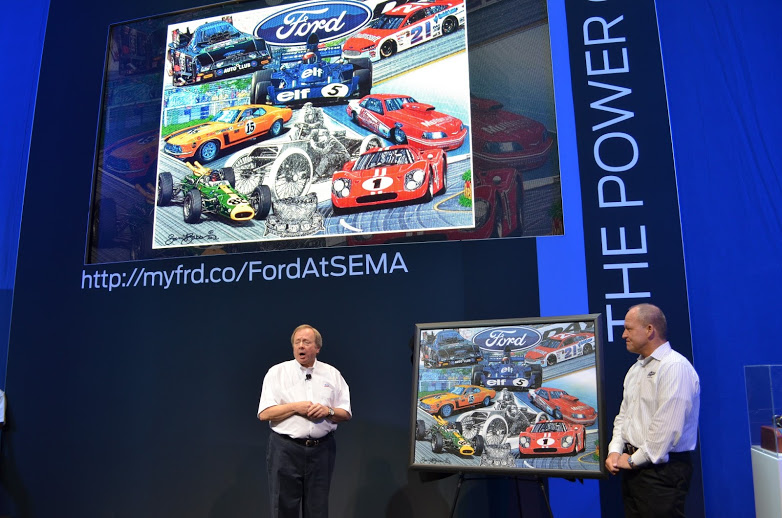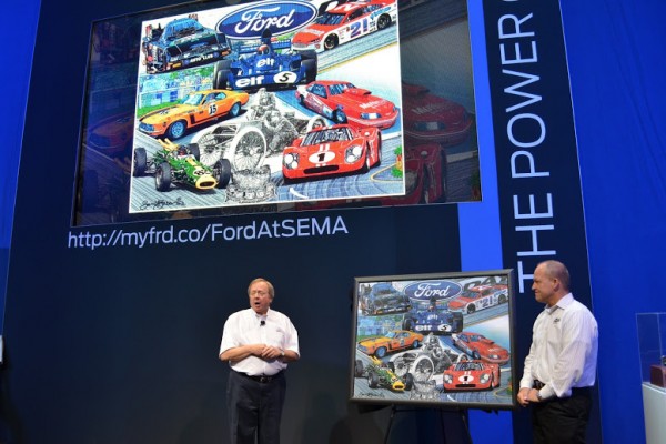 Billy Gibbons of ZZ Top helped kick off the event and introduce Ford’s SoCal Speed Shop 1933 Ford roadster. Representatives from the SEMA Businesswomen’s Network debuted their SEMA Powered by Women Mustang project. And famed automotive artist Sam Bass unveiled his newly created, limited-edition Ford Racing history artwork.