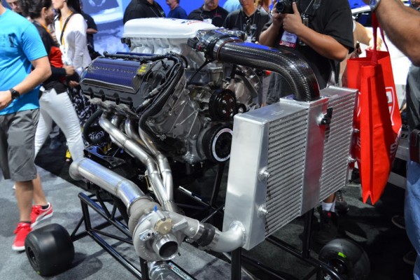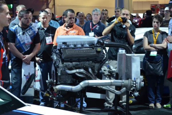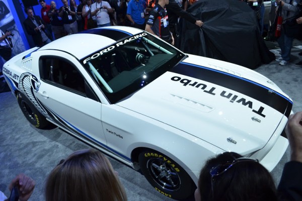 The biggest news to come out of the Ford press conference was the Cobra Jet engine concept built with EcoBoost technology. Ford engineers will look to develop the concept, which aims to deliver increased efficiency over the 2.9-liter blower used on the 2013 Cobra Jet engine. The turbo design used on the Cobra Jet concept incorporates the smallest possible turbos, with very low inertia and low internal friction to increase responsiveness and reduce lag.