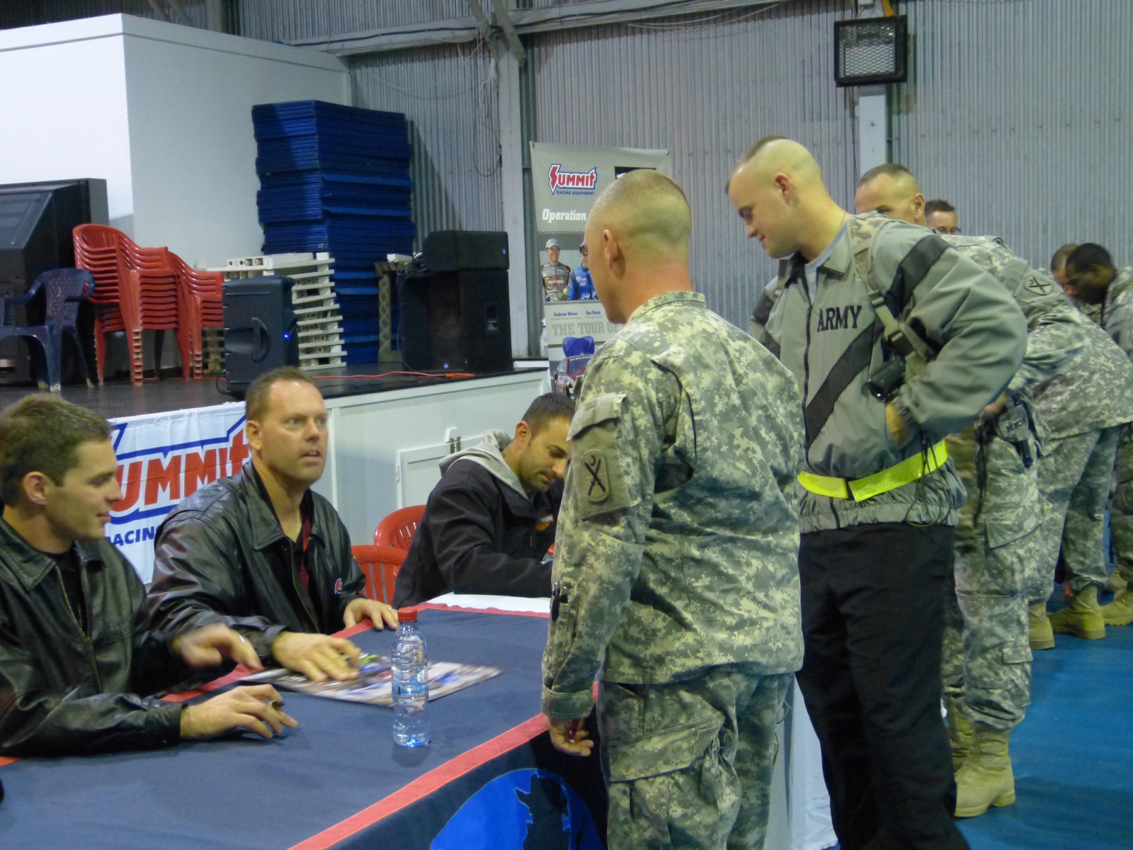 Every place we go there have been surprises, interesting people, a lot of neat stories. Some of these folks would like to spend all day talking to us to catch up on news from home. It surprises me that, as important as their jobs are, they still want to talk about what’s going on in my life, what’s going on back home and what’s going on in this city and that city, what it takes to race competitively. It’s a real eye-opener, it’s something I’m glad I’m involved with and something I’d definitely do at every opportunity. I want to be the first one in line. It’s a great feeling. I hope we can bring some good cheer to the soldiers because they are amazing.
