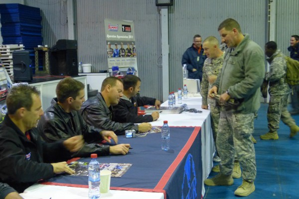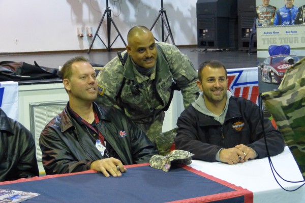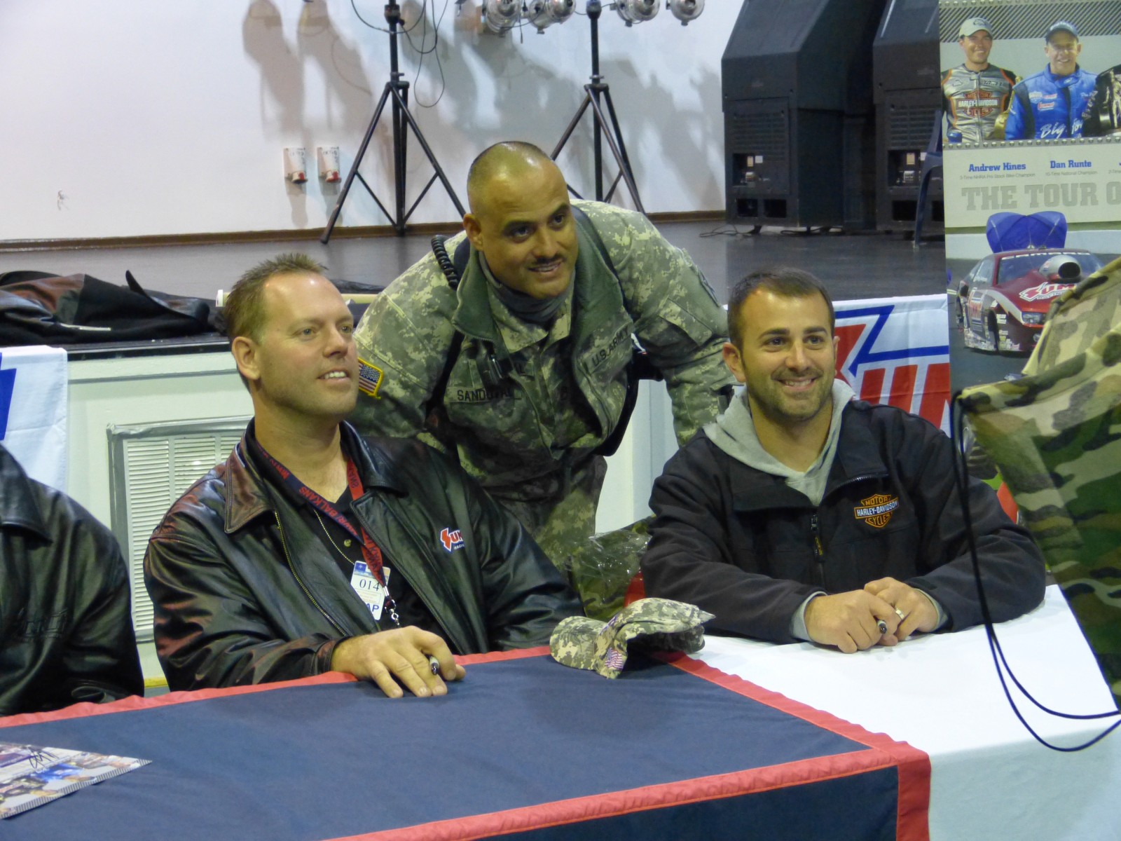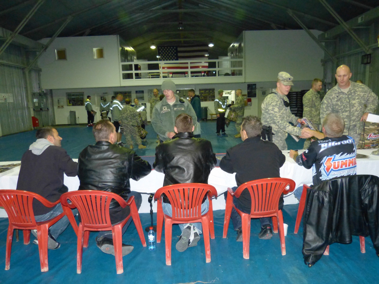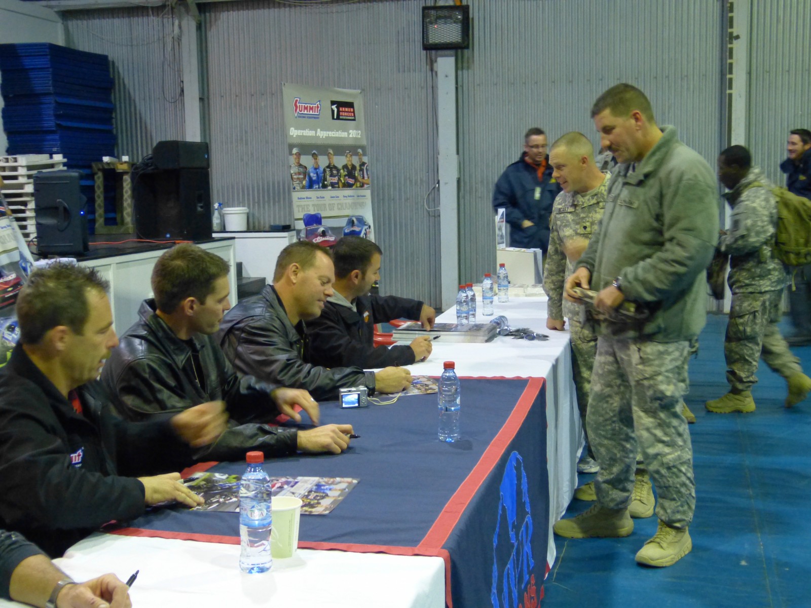 Team Summit visited Camp Bondsteel’s dining facility, where they ate with the soldiers and visited the full-service hospital and the Blackhawk-helicopter-maintenance operation. At each stop, they signed autographs, swapped stories with the diverse groups of men and women, many of them racing fans or automotive enthusiasts.