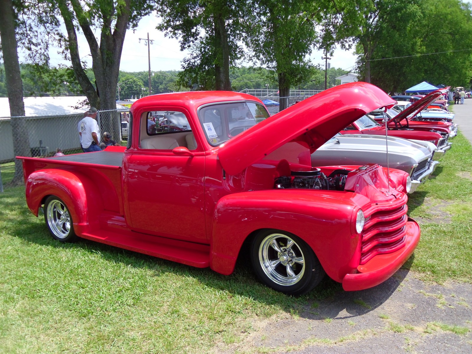 row of vintage cars and trucks at a classic car show