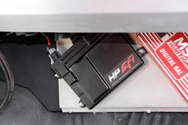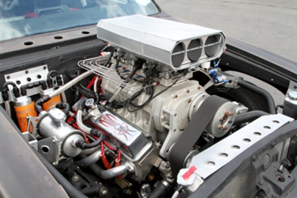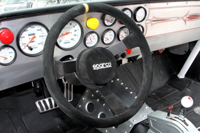 The Weiand 8-71 supercharger is one of the first items to grab your attention and sits on top of a 383-cubic-inch small block Chevy engine. The huge “bug catcher” air scoop is hand made out of aluminum and sits on top of two Holley 900 cfm throttle-body units that make up the Holley HP Electronic Fuel Injection system. The engine is also equipped with a NOS dual plate nitrous oxide system that can add lots of extra horsepower at the flick of a switch.
