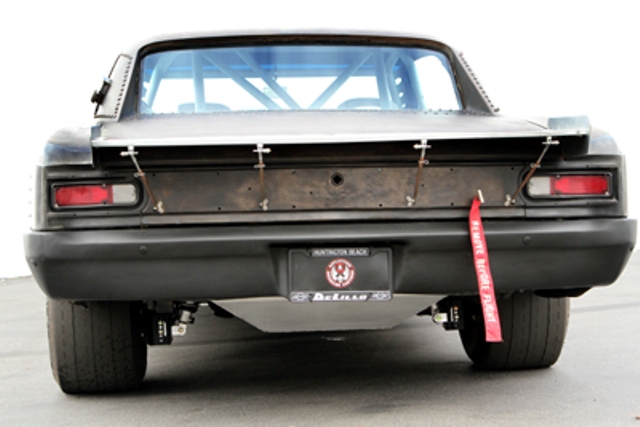 The chassis incorporates a custom front suspension with tubular upper and lower control arms and adjustable coil-over shocks, while the rear suspension is a four-link setup with dual adjustable coil-over shocks. The custom exhaust system uses three-inch diameter tubing and features cut-outs that allow the exhaust to exit in front of the wide Mickey Thompson ET Street race tires. A set of performance mufflers with turn-down pipes complete the exhaust system.
