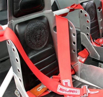 The interior features an aluminum dash and aluminum seats that Hunt created. He also added hand-stitched upholstery that gives a well-worn appearance. The roll cage and racing harness add to the style of the Chevelle, while a nostalgic racing fuel cap on the rear driver’s side feeds a custom aluminum tank in the trunk. The B&M shifter operates a GM TH-350 automatic transmission that channels the power to a GM 12-bolt rear axle.