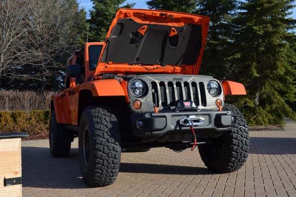 The Jeep Wrangler MOJO (the “OJ” in the name stands for “Orange Jeep”) is geared for the off-road enthusiast who seeks an even tougher vehicle with the functionality to tackle the most extreme trails. A Jeep Performance Parts 2-inch lift provides the clearance to traverse obstacles, with locking Dana 44 front and rear axles and a 4:1 Rock-Trac transfer case adding to Wrangler MOJO’s rock-climbing capabilities. Wrangler MOJO’s crawl ratio is 59:1. The vehicle’s 3.6L V6 engine is augmented with a cold air intake and low restriction exhaust system.