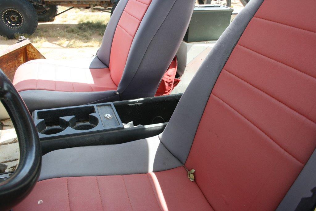 The Jeep’s seats ended up hard and unforgiving when the Jeep hit a rock or rut too hard, and several small cuts and scratches in the original covering material were becoming too big to ignore. The older seat belts and center console had also seen better days. The console lost its lid a few years ago when the wood frame became too weak to hold it. The seat belts’ couplers were so worn they were quite difficult to release and we were worried they could stop locking at any time.