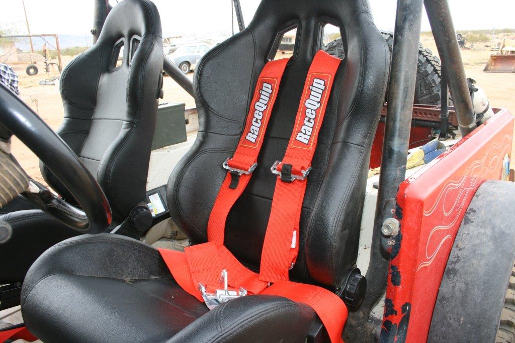 The Racequip four-point harnesses have three-inch wide lap belts and two inch shoulder straps. They keep us in our seats no matter how rough things get, and the added width is much more comfortable during long hours on the trail.