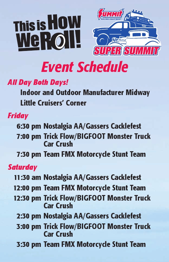 Join in the fun and the savings at Summit Racing Equipment Super Summit 2014! Just like last year, we combined Super Summit and TruckFest for one HUGE two-day event running Friday, June 20th from 2pm to 9pm and Saturday, June 21st from 9am to 5pm at the Summit County Fairgrounds. Admission and parking is FREE both days!