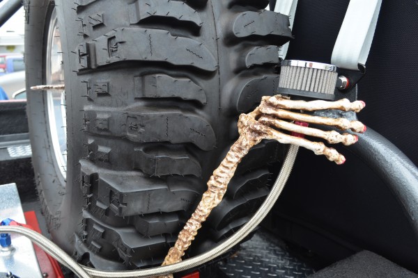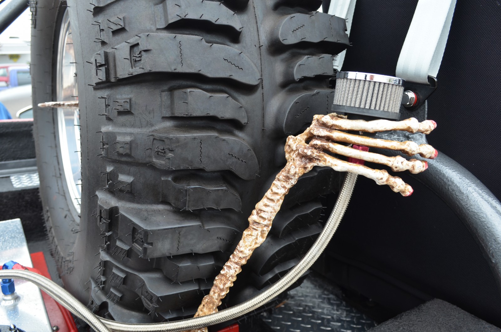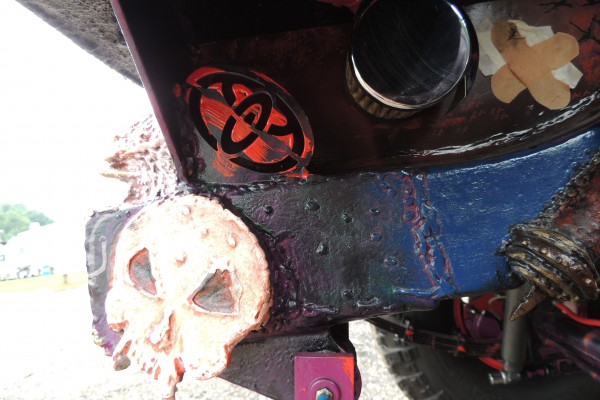 “I see tube frames. I see painted frames. I see stainless steel frames. But I’ve never seen that,” Sell said, pointing to the back end, sturdied by a four-inch square steel bar featuring four uniquely designed skulls. The third from the left is the first skull he ever made for the vehicle.