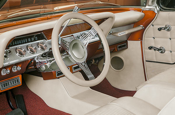 If you think the Impala’s beauty is only skin deep, just open one of the massive doors and check out the eye-popping interior. The car’s original stainless and chrome interior accent pieces shine like diamonds against the sumptuous sandalwood leather covering the factory seats, door panels, and custom console. A leather-covered Billet Specialties steering wheel adds the perfect blend of old school style and modern hot rod attitude.