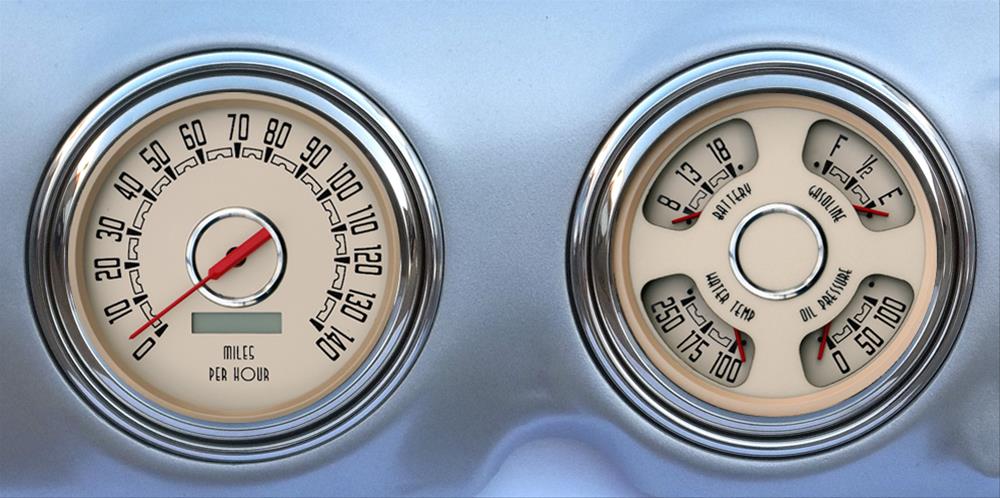 These Gauge Packages are available with two 3 3/8-inch diameter gauges with your choice of Woodward Series or 1940 Series gauges. Most are available as a kit with a speedometer and quad gauge kit (water temperature, oil pressure, fuel level, and voltmeter), a speedometer/tach combo and quad gauge, or a speedometer and individual gauges.