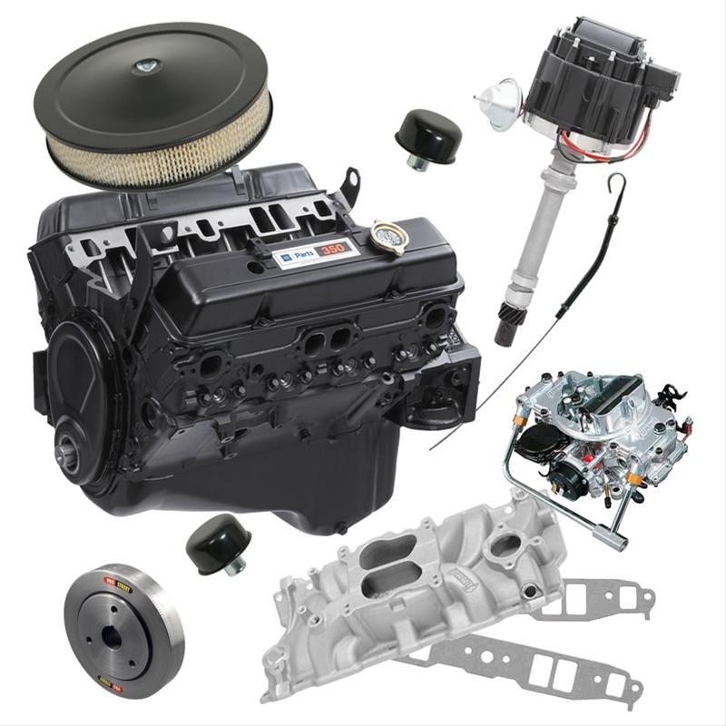 Looking for a crate engine for a mild street machine, street rod, or just your old beater work truck? Summit Racing has you covered with these 350 C.I.D. 195 HP Engine Combos. The combos are based on the Chevrolet Performance 350/195 HP long block. Built with all-new parts, the 8.5:1 compression engine features 4-bolt main/2-piece rear main seal block, cast iron rotating assembly, a flat tappet hydraulic cam (.383 intake/.401-inch exhaust lift, 194 intake/202 exhaust duration at .050 inch), cast iron cylinder heads with 76cc open-style chambers and 1.94 intake/1.50-inch exhaust valves. You also get painted valve covers, oil pan, and timing cover.