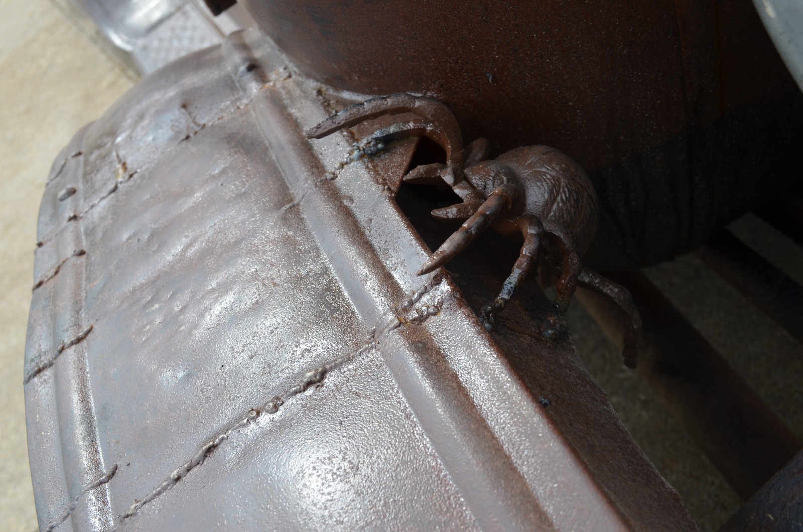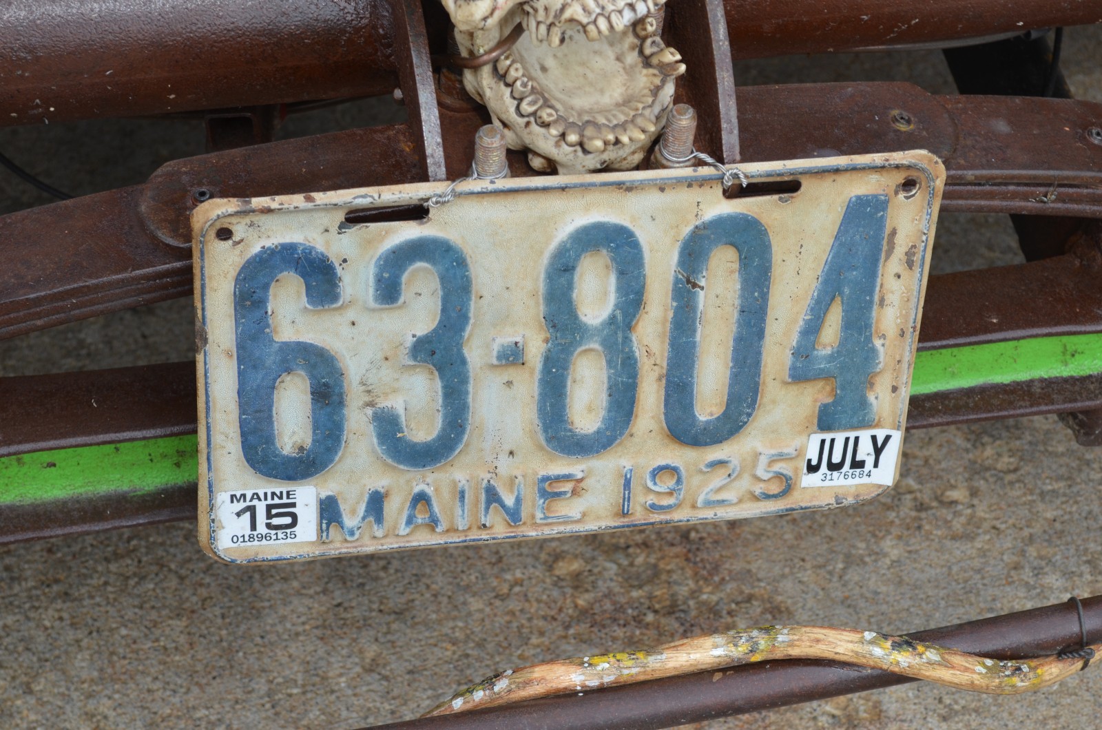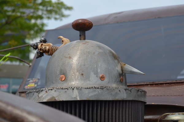 The skull on the front bumper belonged to Sue’s son when he was a child. The swords came from a friend, and Frenchie made his own modifications to them (even dulling one down after he accidentally sliced his arm on it recently while working on the engine). The cap on the air filter was built out of a World War I civil defense helmet.