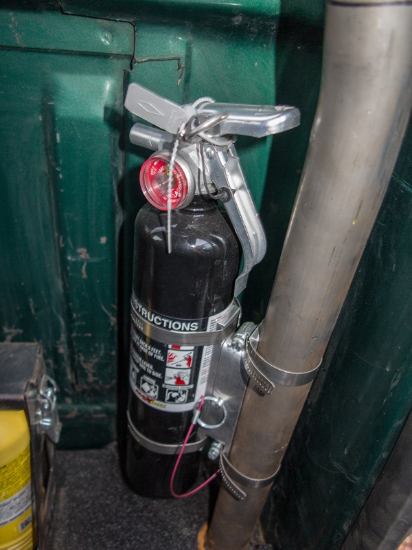 The more expensive HalGuard is rated for B and C fires and puts out the flames without doing any additional harm to the vehicle or electronics. The MaxOut is A/B/C-rated and is less expensive, using a dry chemical instead of halon. By carrying both, we can deal with a fire with the halon extinguisher first, and then move to the MaxOut if the halon version isn’t effective (say, if there’s a wood fire on the trail). Plan C is to start shoveling dirt to smother the fire.