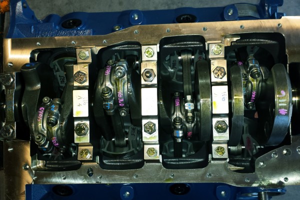 A peek at the rotating assembly shows the weight of each piston and connecting rod is marked with its weight in grams. That shows that the rotating assembly has been balanced to minimize harmonic vibration, which greatly improves engine durability and life expectancy.
