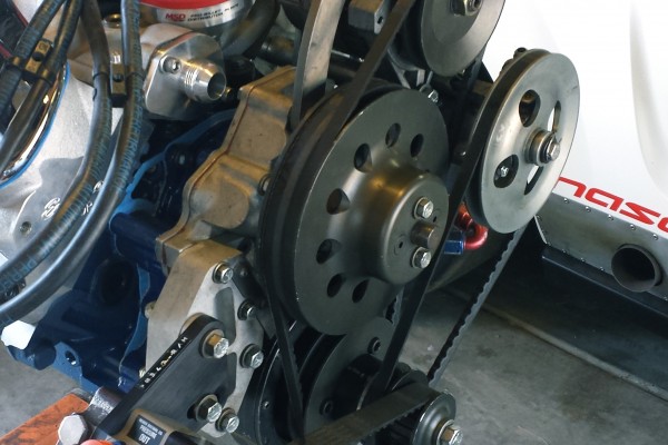 Here you can see the ribbed front accessory drive. From left are the oil pump, a Summit Racing front cover, and the water and power steering pump from the old NASCAR engine. You can also see the MSD Pro-Billet distributor and ignition wires.