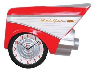 Add a little retro to the walls with this 1957 Chevy Bel Air Wall Clock! The brightly painted resin clock incorporates the iconic 1957 Chevy tailfin into its design and operates on a single AA battery.
