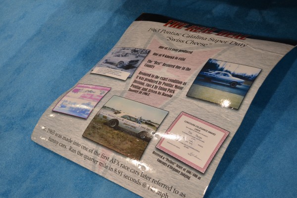 Because “Swiss Cheese’ Catalinas were so rare, they were reserved for only established racers—guys like Mickey Thompson and Arnie “The Farmer” Beswick. The one you see here was driven by Harold Ramsey, a salesman for East Coast dealership Union Park Pontiac. Like many dealerships of the day, Union Park lived by the mantra, “win on Sunday, sell on Monday.”