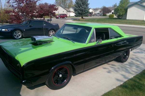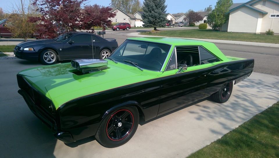 “66 Dodge Coronet. Custom bodywork and paint job done by myself. Smoothed out bumpers. Ford 9”. Wilwood disc brakes, Custom built air box topped off with a air cleaner from Summit. Demon 850 carbon. 727 Torqueflite trans with stage 2 shift kit. 500hp 440 with a high rise intake. Wheels off of a 92 IROC Z powdercoated black and pinstriped by myself. Black interior with buckets and center console with a quick silver shifter from Summit as well.”