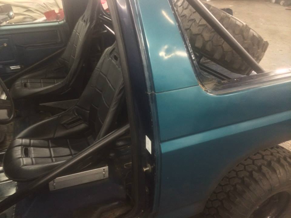 Marc began the conversion of his ’84 Bronco from old truck to desert racer by adding a Skyjacker Softride two inch lift kit with Nitro shocks front and rear to add some suspension travel and make room for the 33.5 inch tall Maxxis Bighorn tires and Pro Comp Xtreme Rock Crawler wheels. He swapped out the old 302 small block for a 331 cubic inch motor that makes about 350 horsepower, patched the front driver side floor, and installed a set of Summit Racing race seats.