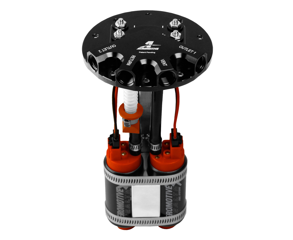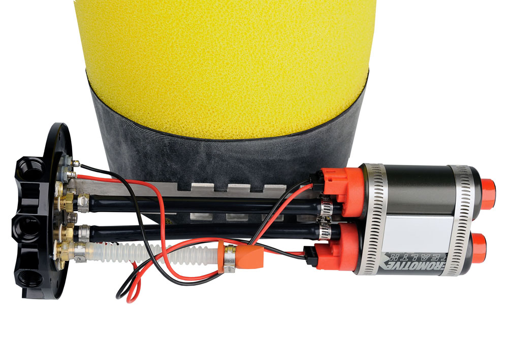 From the mechanical perspective, the Dual Phantom is based upon a pair of 340 liter-per-hour (lph) pumps, an additional set of electrical bulkheads, along with a larger capacity foam and bladder. According to Aeromotive, the separate electrical bulkheads allow for an “on demand” fuel system, which reduces the amount of returned fuel, lowers the tank temperature, and pretty much eliminates both vapor lock and cavitation. This pump supports up to 2,000 horsepower (naturally aspirated and carbureted); 1,700 horsepower (forced induction and carbureted); 1,700 horsepower (naturally aspirated and EFI), or 1,400 horsepower (forced induction and EFI). All of the wiring hook ups are external. Additionally, the black anodized top hat is fitted with four -6 AN ports. Two are for the supply, one is a return, and the last is a vent.