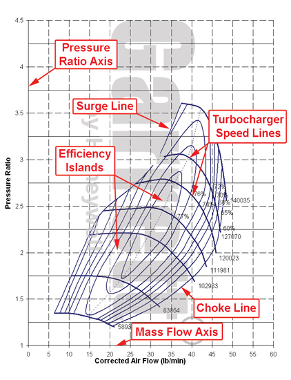 However, if you’re looking to do a little more research on your own, a compressor map may come in handy. A compressor map is basically a chart that shows things like efficiency range, surge lines, and maximum speed of a specific turbocharger on a given engine.