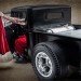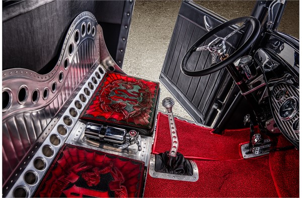 If the black-on-black bodywork serves as the outline for Mounce’s design, then the cab’s interior is where he packed in the color. And that color is red. In stark contrast to the truck’s monotone exterior, the interior comes alive with vibrant reds, set against ample amounts of brushed and polished aluminum. The bomber-style bench seat is a one-of-a-kind creation by metal-shaping master Jamey Jordan of Handmade Seat Co., topped with embossed leather cushions of Mounce’s own design. Other touches include Blood Red loop carpeting, a Lime Works 3-spoke steering wheel, Moon gauges mounted in a unique finned dash insert, and a custom shift knob inset with a genuine 1932 silver quarter.