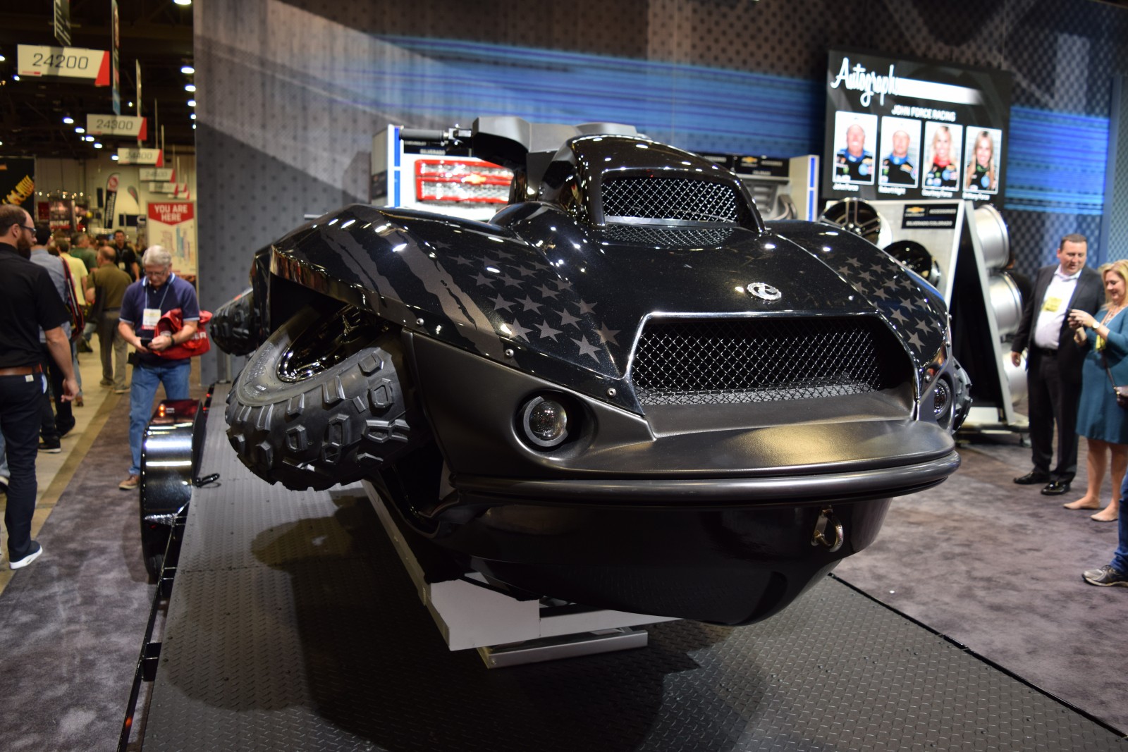 The truck is a “Dual rear wheel Silverado Heavy Duty concept with a 6.6 Duramax Turbo-Diesel V8 (created alongside Kid Rock),” according to its description sheet. It “features Dazzling Black paint and a specially crafted oversized Chevy bowtie on the grille. For added fun, the show truck is displayed pulling a trailer loaded up with two GIBBS Sports Amphibians Quadskis,” which were painted to match the truck.
