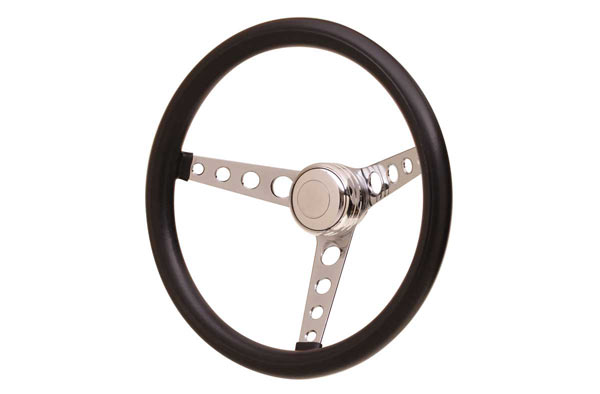 These steering wheels have an extra thick black foam grip. Each spoke has four chamfered lightening holes to give the wheel that timeless race look. You get a choice of spoke styles—black powdercoated steel with lightening holes, chrome plated steel with lightening holes, or chrome with full cutouts.