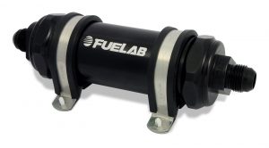 FUELAB Fuel Filters are available with a choice of filter elements: 10 micron paper, 40 micron stainless steel, 75 micron stainless steel (recommended as a fuel pump pre-filter), and six micron fiberglass for ultimate filtering. The filter housing has machined internal radii to help minimize fuel pressure drop, and the filters are rated to 200 PSI maximum pressure. The filters are available in three and six-inch lengths and are compatible with most fuels.