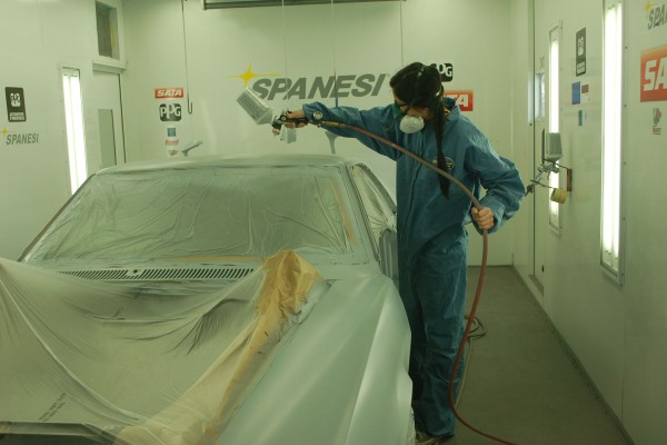 The body was straight with no major rust (thanks, California), but JoAnn Bortles of Crazy Horse Painting and her team had plenty of work to do. Stripping the car revealed numerous quick repairs of bumps and scrapes from its racing days. Work that would normally take a month or more had to be done in 12 days. The team put in some brutal 16 and 18 hour days getting the body ready for paint—Deltron Wimbledon White basecoat and custom-mix PPG Deltron Starlight Blue Metallic stripes. This paint scheme replicates the original, but the team added some Easter eggs including ghost stars in the stripes and number roundels.