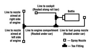Finally, you’ll need to figure out optimal discharge nozzle placement. Again, the Safecraft RS fire suppression system gives you the most comprehensive coverage with its three discharge nozzles. You can aim one each at the driver, engine, and fuel cell. For a little bit less money, you can opt for the two-nozzle configuration of the LT system. Again, the driver is most important, so aim the first nozzle at the driver’s area and the second at the engine. You can always add more discharge lines later by using T-fittings on your existing lines (see diagram above left). Keep in mind, though, additional discharge lines will require additional fire suppressant.