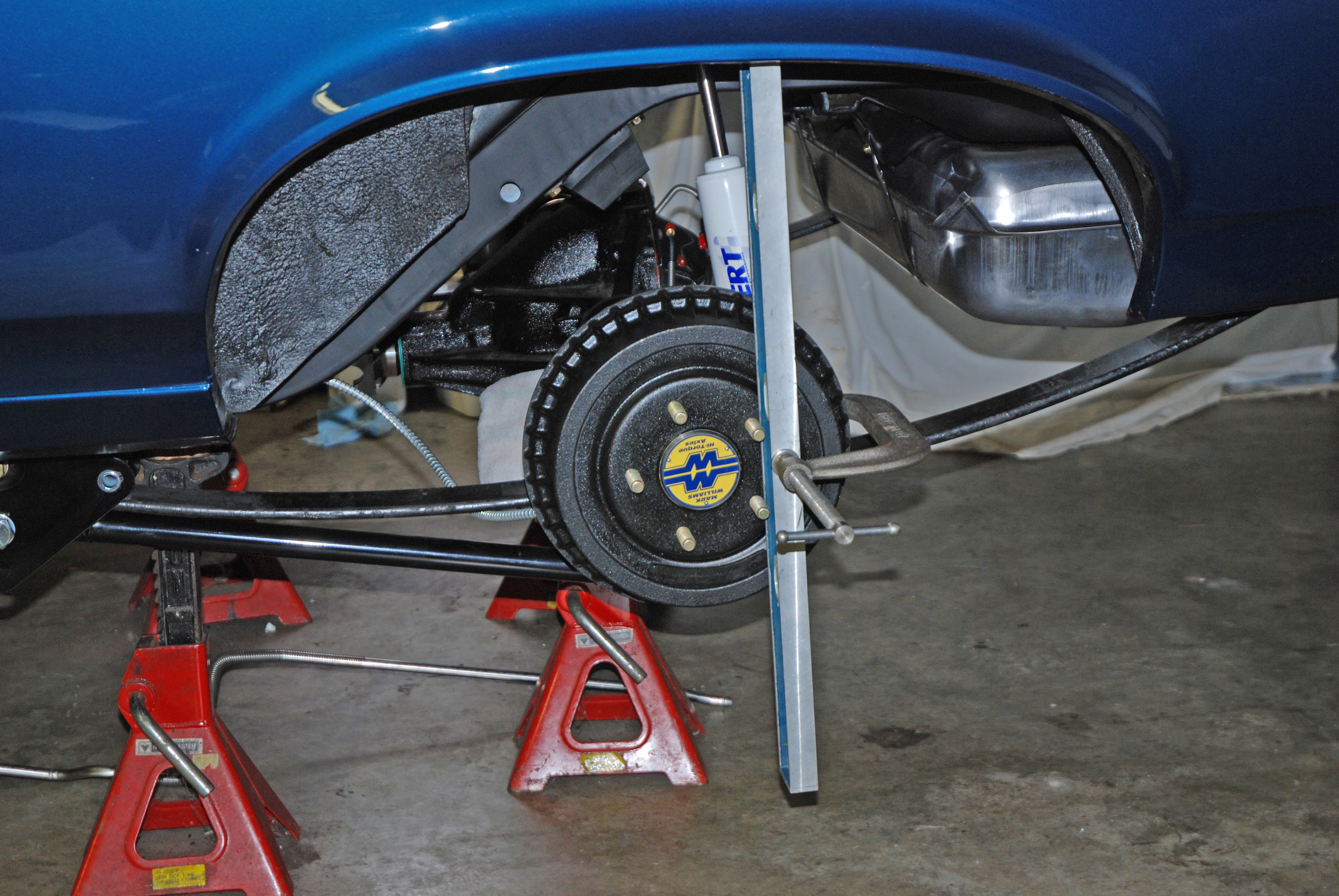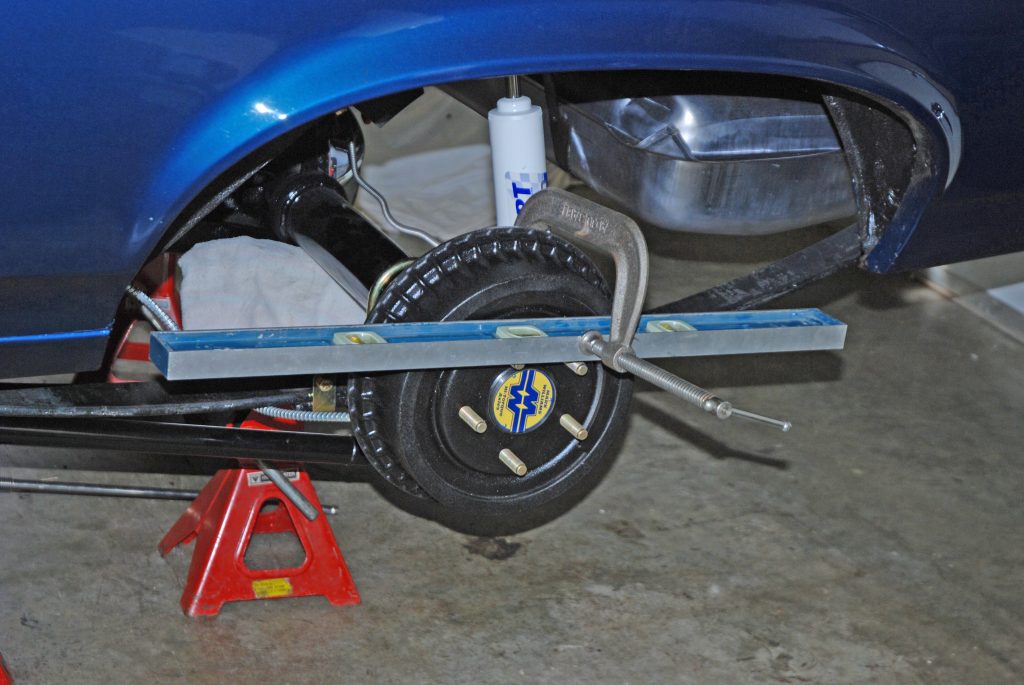 1. Clamp a straight edge (in this case, a carpenter’s level) on the brake drum and take measurements from the brake drum mount surface to various locations on the the inner wheel well. At the same time, take measurements from the brake drum to the outer body (most likely, the wheel well lip). Start at horizontal as shown here.