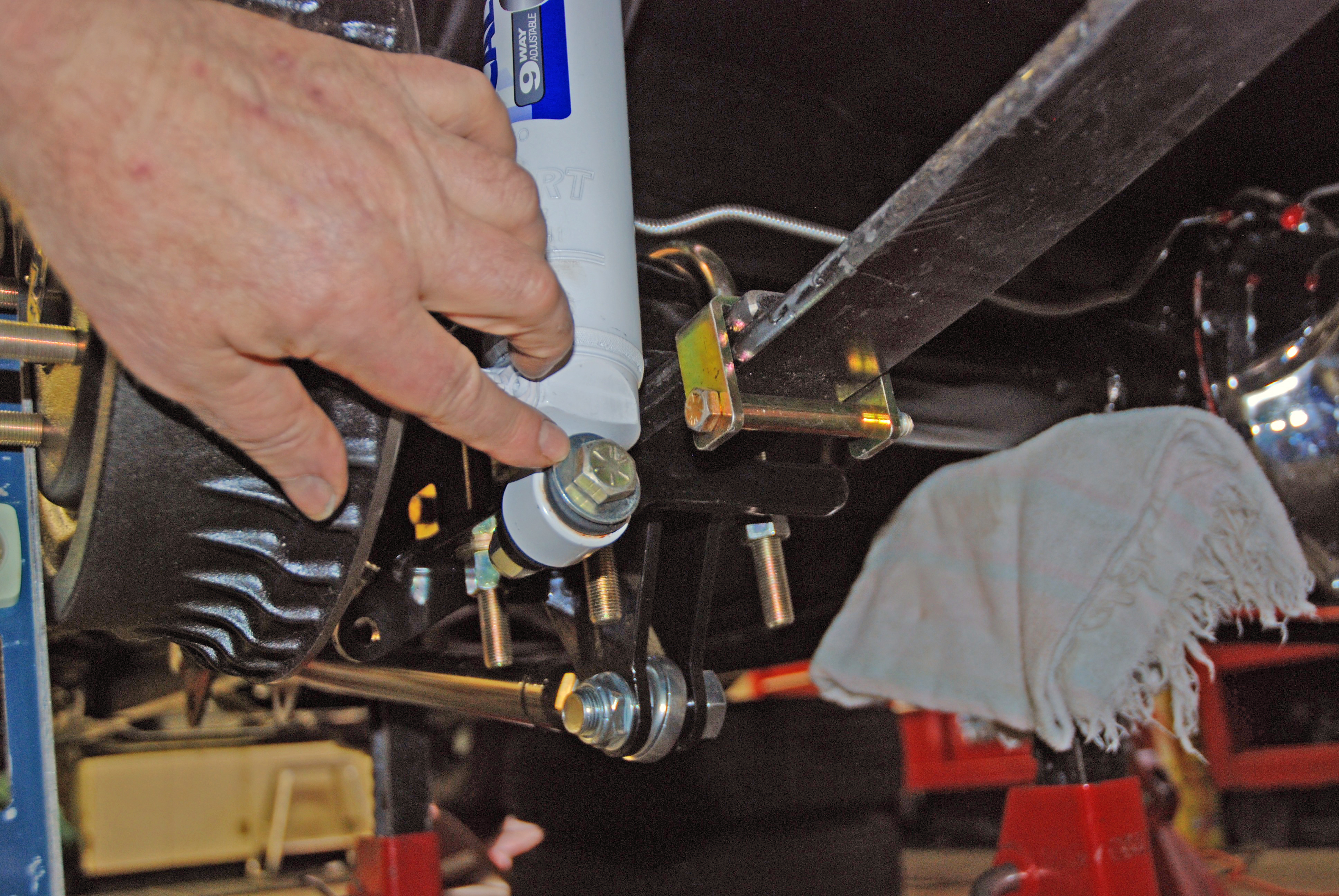 If it does interfere, the solution is to swap out this Grade 8 bolt on the lower shock mount for a shock stud. The shock stud can be bent a few degrees and that will effectively rotate the shock away from the wheel. You can’t go too far because cars such as this Nova use a double bolt tie bar for the upper shock mount, which can lead to shock bind.