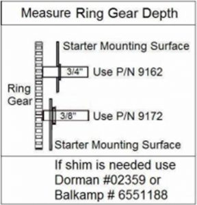 A: Because the starter mounts to the bellhousing on the Ford engine, the bellhousing directly determines the starter to be used. If the bellhousing is designed to house a 164-tooth (large diameter) ring gear, the location of the starter would be moved outward to allow for this larger diameter ring gear. Conversely, if the bellhousing is designed to house a smaller 157-tooth ring gear, the starter position would then be moved inward so the starter and ring gear would mesh properly when trying to start the motor. Also, Ford uses what they call a thin (usually 1/8-inch) block separator plate, which plays a role in obtaining the correct depth measurement and, ultimately, the correct starter for the application. As per J&W instructions, this separator plate MUST BE used!