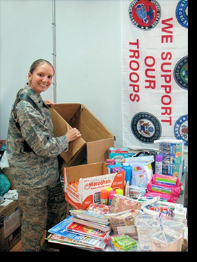 Club members cram boxes (weighing up to 48 pounds) with more than 200 provisions, ranging from socks to toothpaste, granola bars to puzzle books, postcards to car magazines—non-issued items that bring a touch of home to a soldier’s stressful surroundings. Each package costs about $255 to fill and ship.