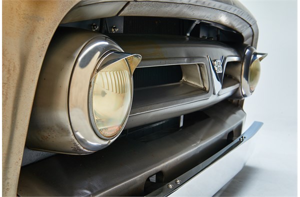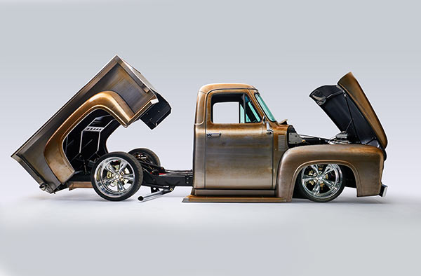 Body: 1953 Ford F-250; forward tilt hood; shortened and widened tilt bed, tailgate, running boards, and front and rear bumpers all built by owner
