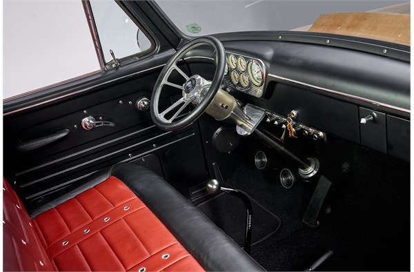 Front Suspension: TCI Mustang II-style independent front suspension and stabilizer bar, 2″ drop spindles, Pete & Jakes front shocks, Firestone air bags