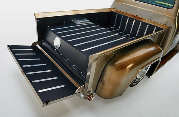 In a nod to this farm truck’s past, Sayers also added an actuator to the underpinnings of his custom bed. “They were throwing out an old air-powered lift table actuator at work, and they asked me if I wanted it,” he said. Being the resourceful hot rodder he is, Sayers didn’t think twice. With a flip of the switch, the Ford’s bed tilts up in the air like a dump truck, revealing an undercarriage overflowing with details.